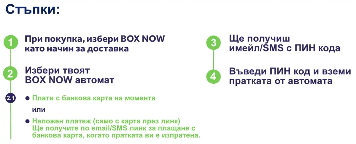 ВНИМАНИЕ! При поръчка с доставка до автомат на BOX NOW няма опция „Наложен платеж“ с плащане в брой. Плащането на наложения платеж трябва да се направи с банкова карта през линк, който ще получите по SMS/имейл или Viber при изпратената поръчка.