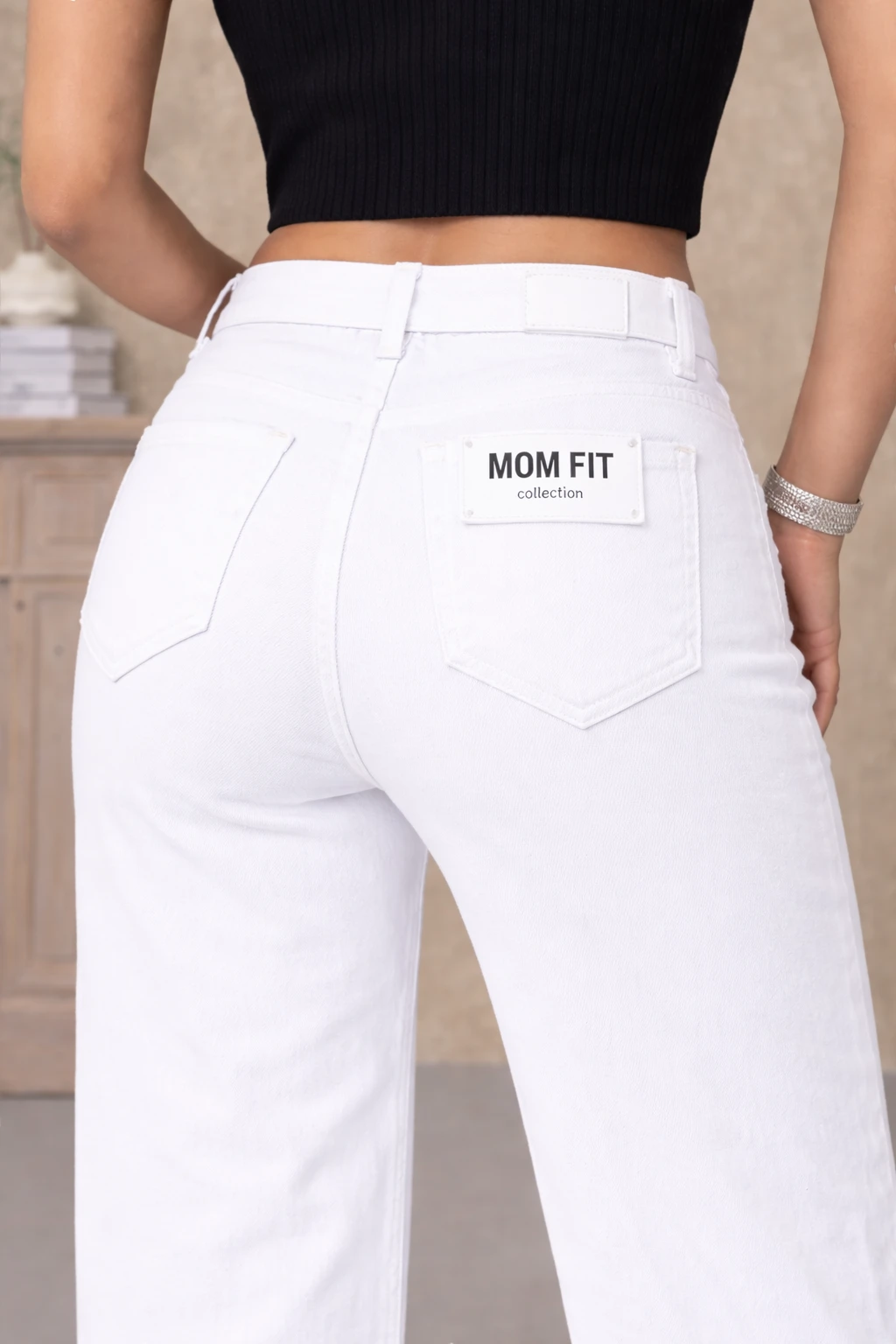 – Бели дънки с четири джоба, стандартна талия и прави крачоли