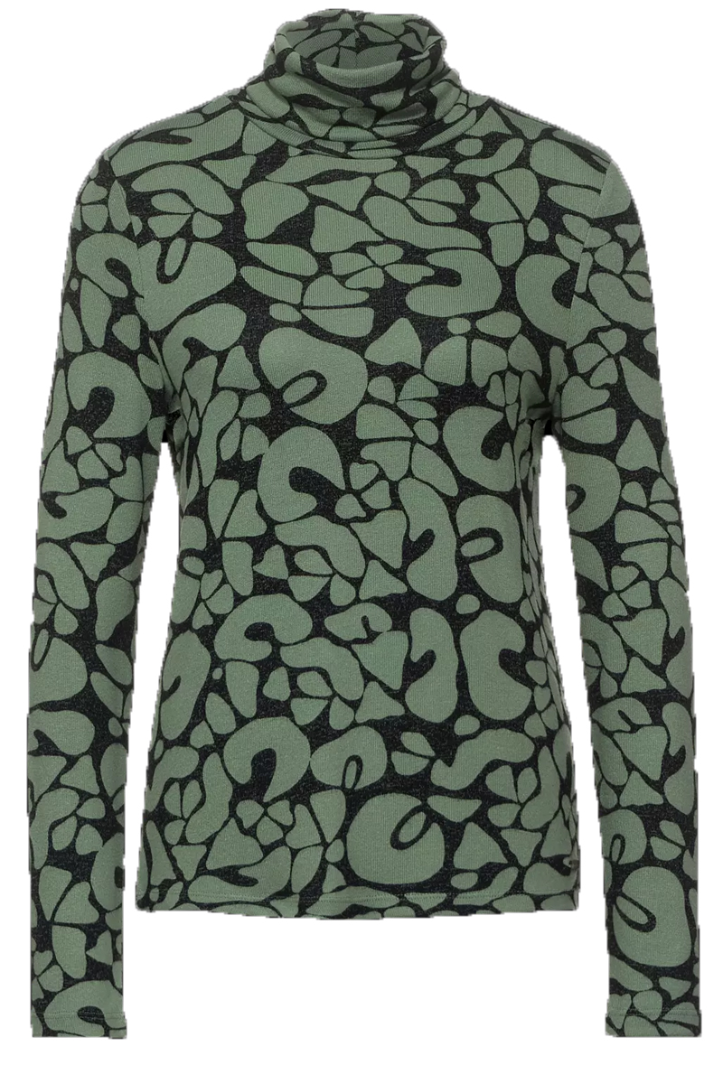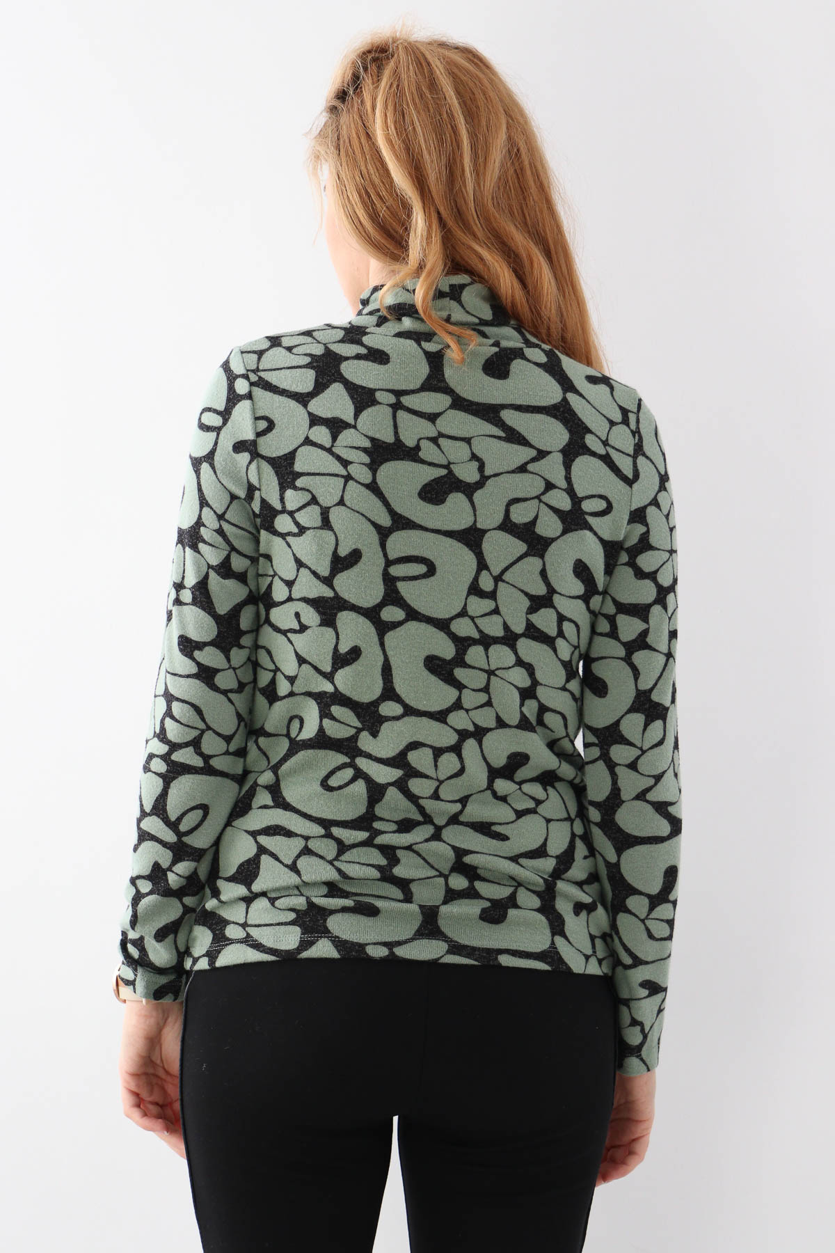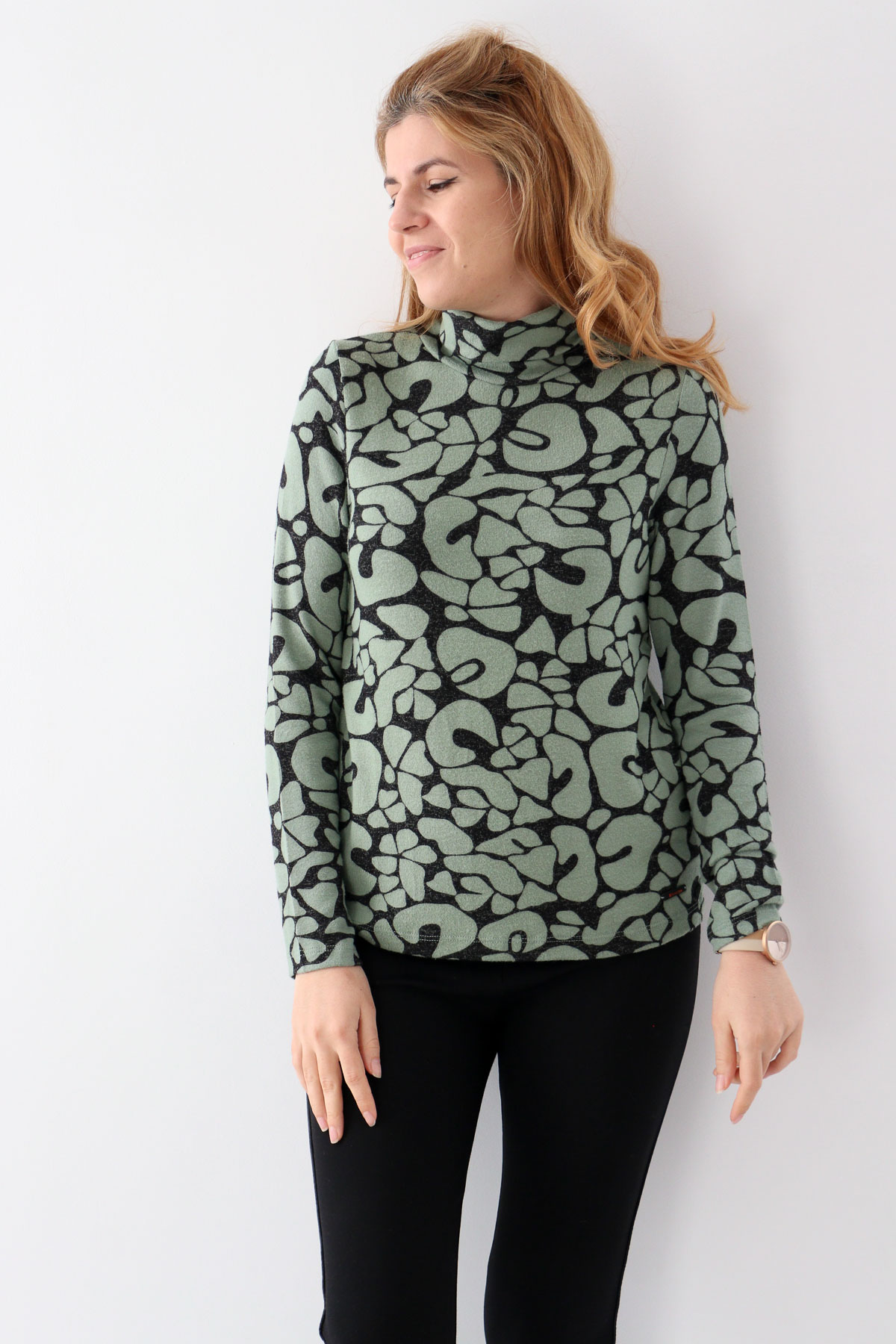 -Дамска поло блуза на зелено-тъмно сиви фигури с дълъг ръкав