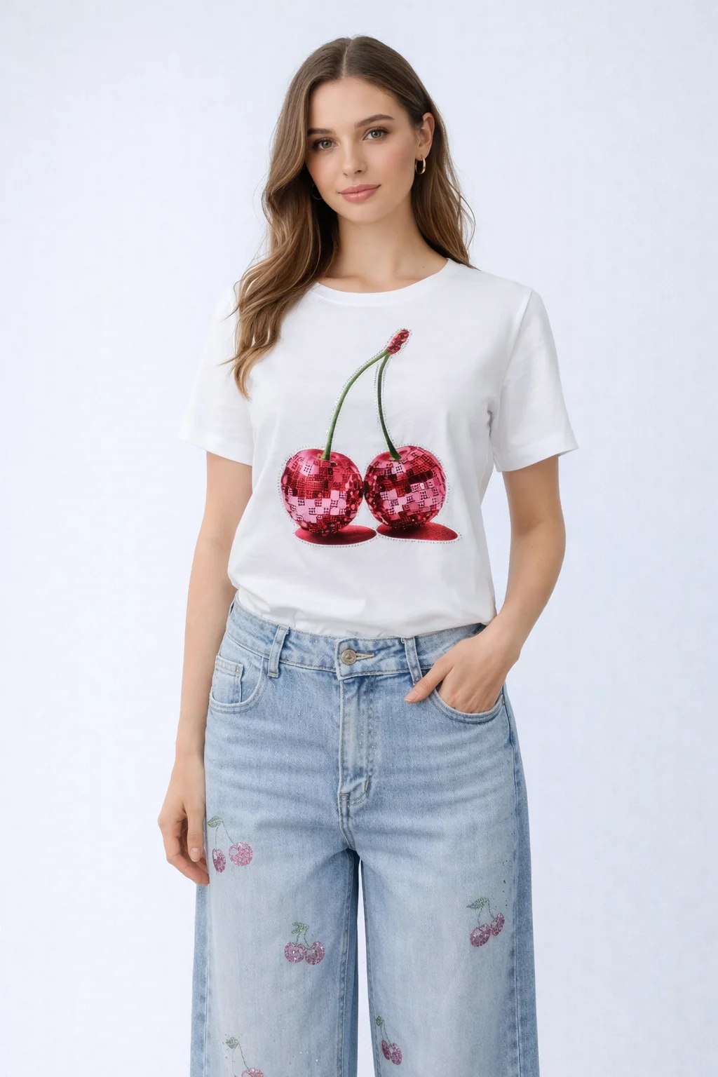 -Тениска с принтирани череши и обемни елементи