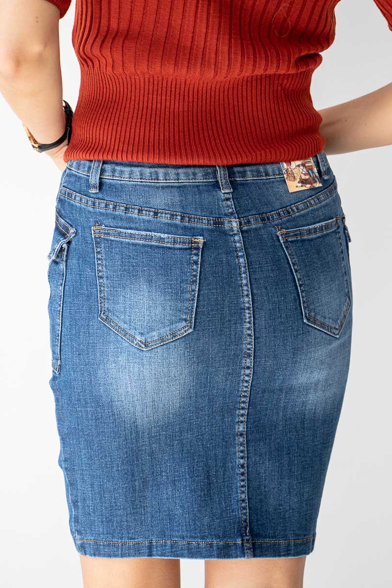 Моделът е с височина 169 см, ханш 90 см и носи продукт с размер 28.