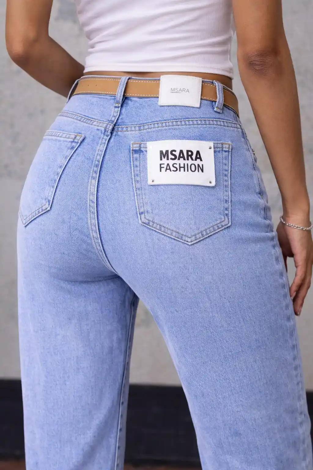 – Изчистени дънки в светло синьо с четири джоба, стандартна талия тип балон