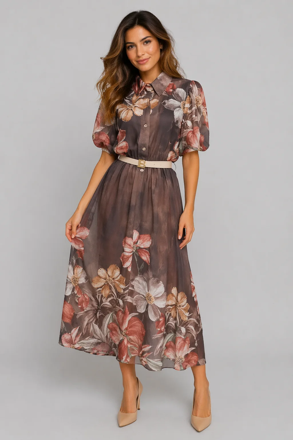 Флоралният десен в топли земни тонове създава усещане за мекота и естествена елегантност, подходяща както за ежедневието, така и за по-специални поводи. Тънкият колан в талията подчертава фигурата и оформя стилен завършек на визията.