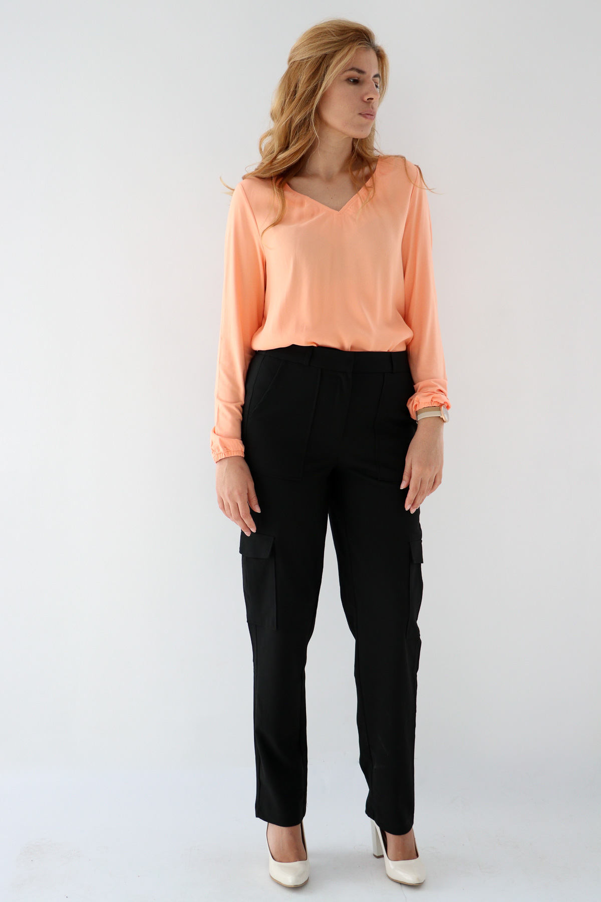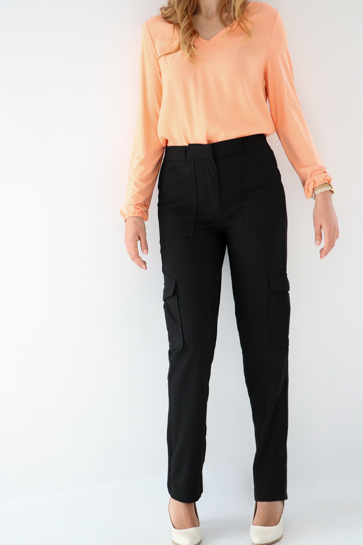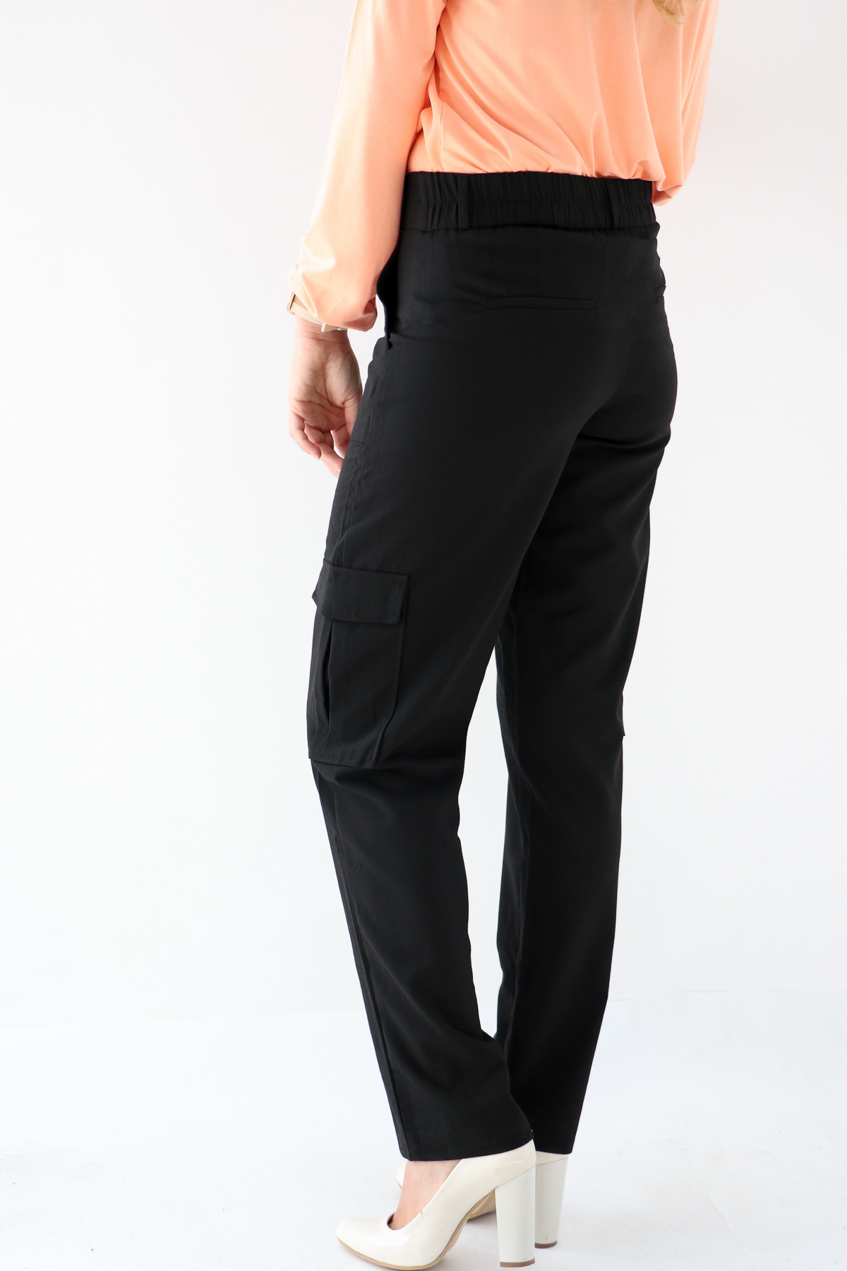 -Карго панталон от еластичен плат с два горни и два странични джоба, висока талия и права кройка на крачола в черно.