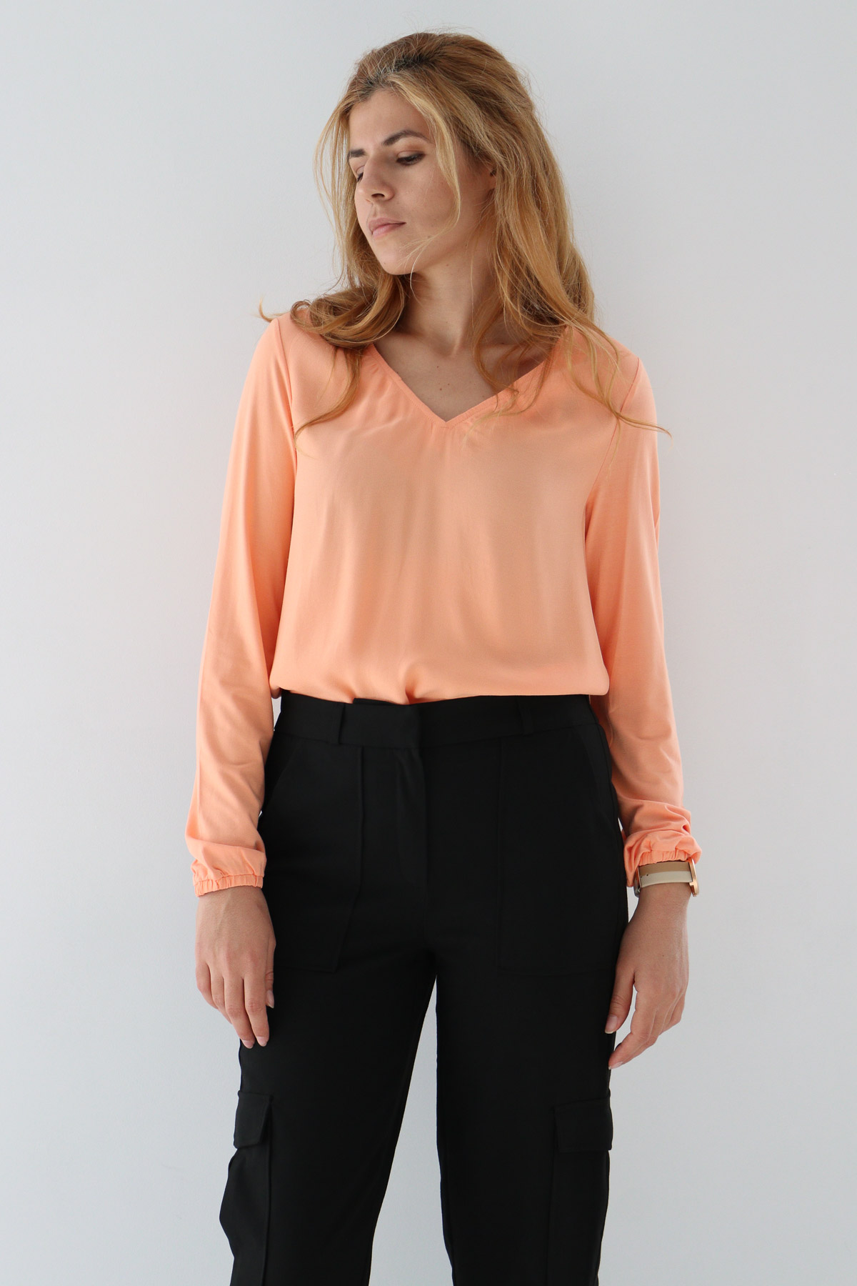 Моделът е с височина 169 см, ханш 92 см и носи продукт с размер 36.