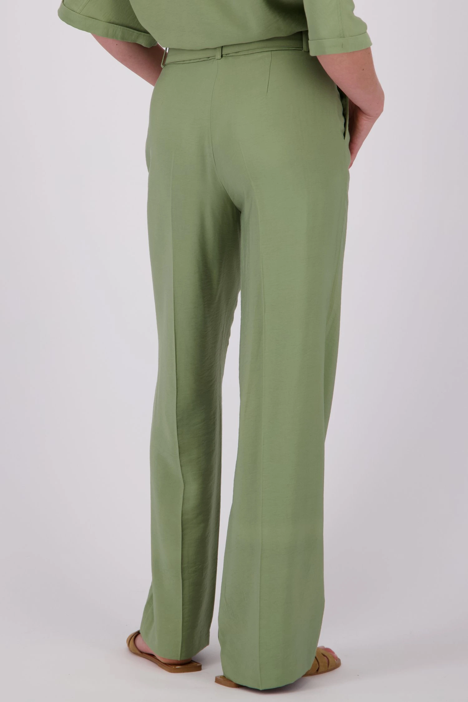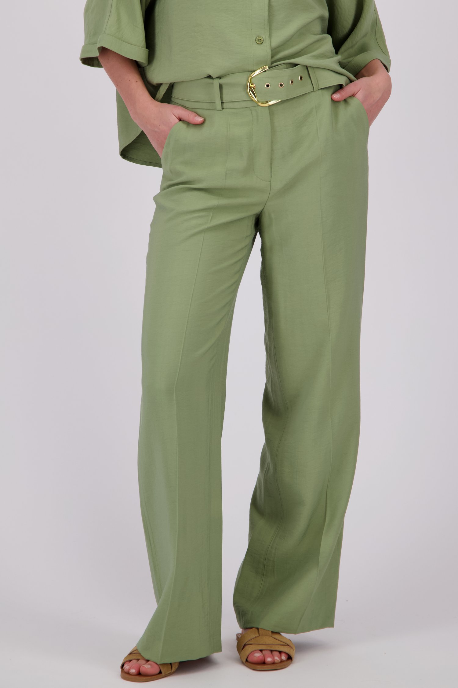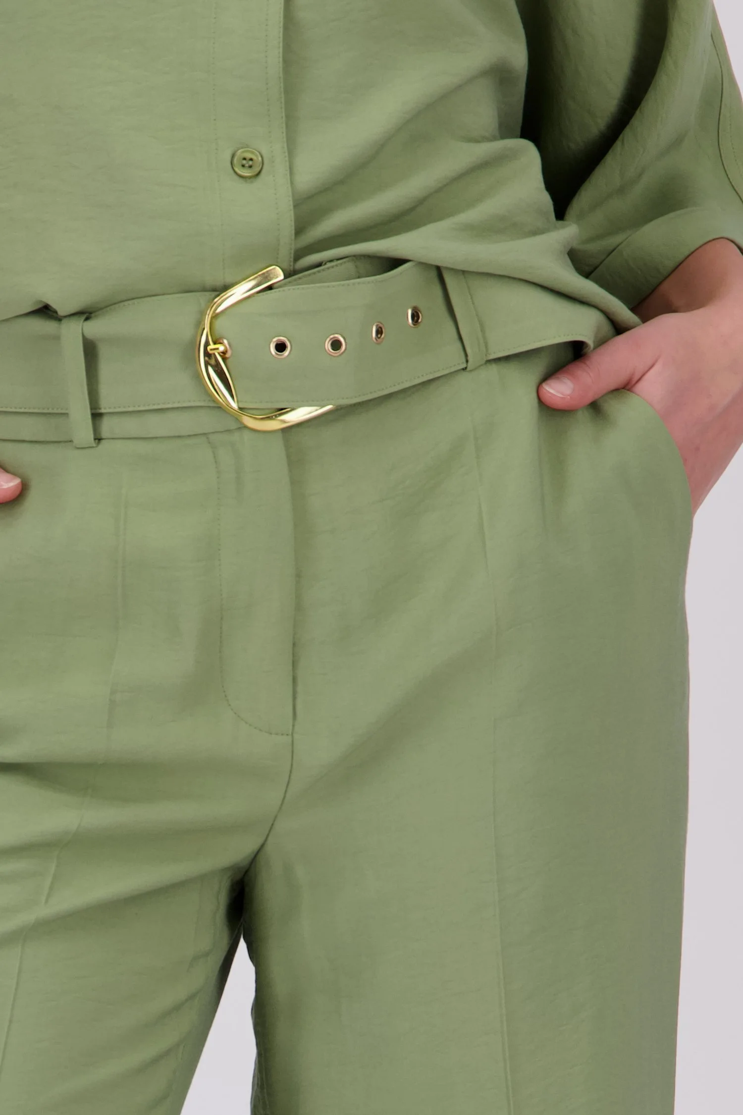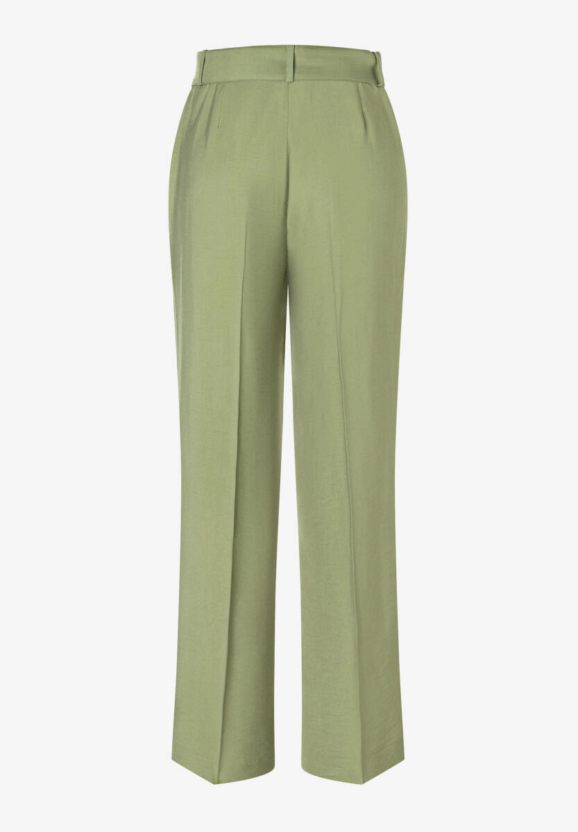 Широки маслиненозелени панталони от More & More . Коланът в същия цвят със златна катарама добавя стилен щрих. Завършват с гайки за колан, закопчаване с копче и цип, както и скосени джобове. Носете ги небрежно с тениска и маратонки или ги допълнете с блуза и обувки на ток. От офиса до уикенда: тези панталони се движат без усилие с вас.