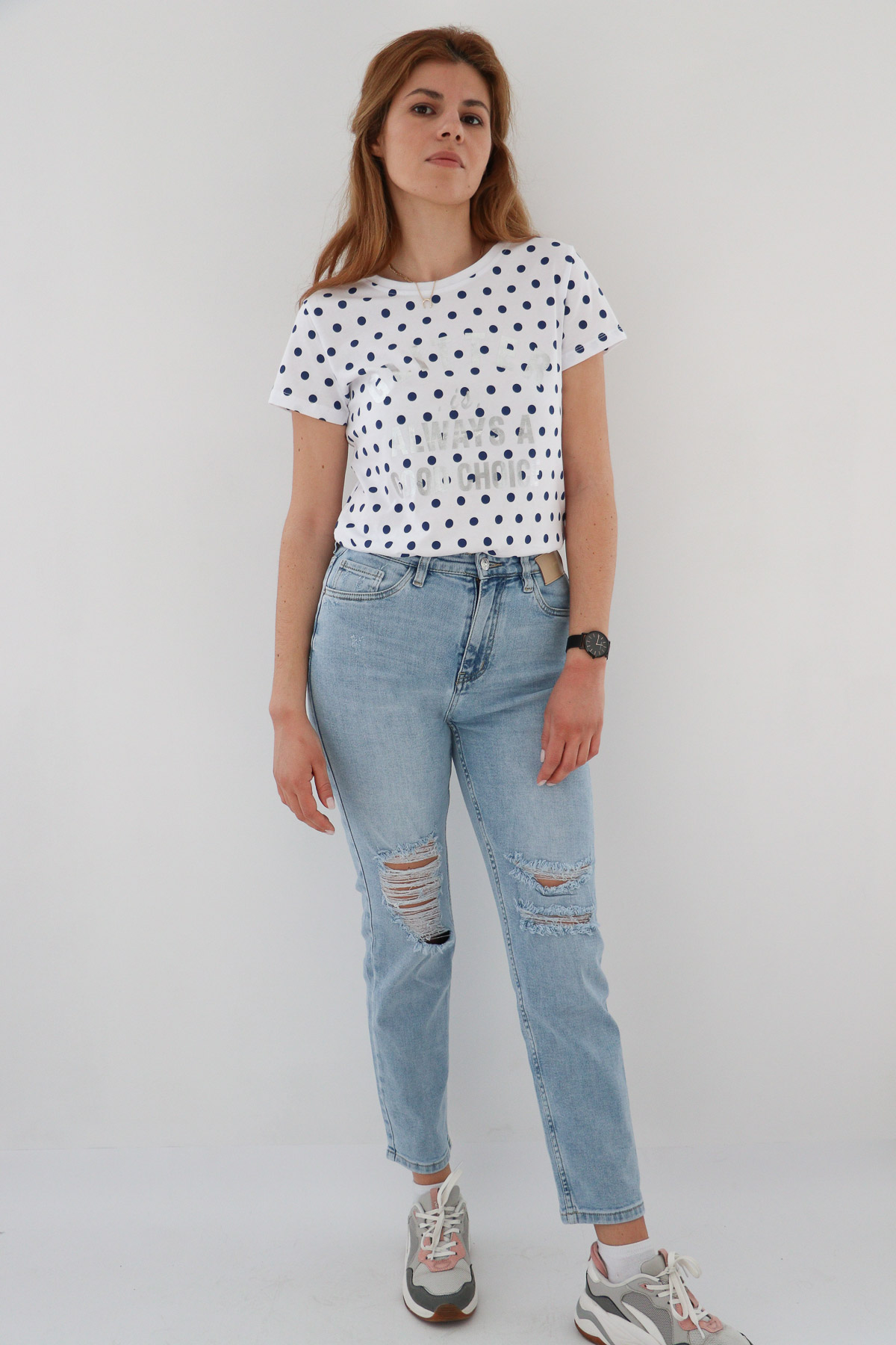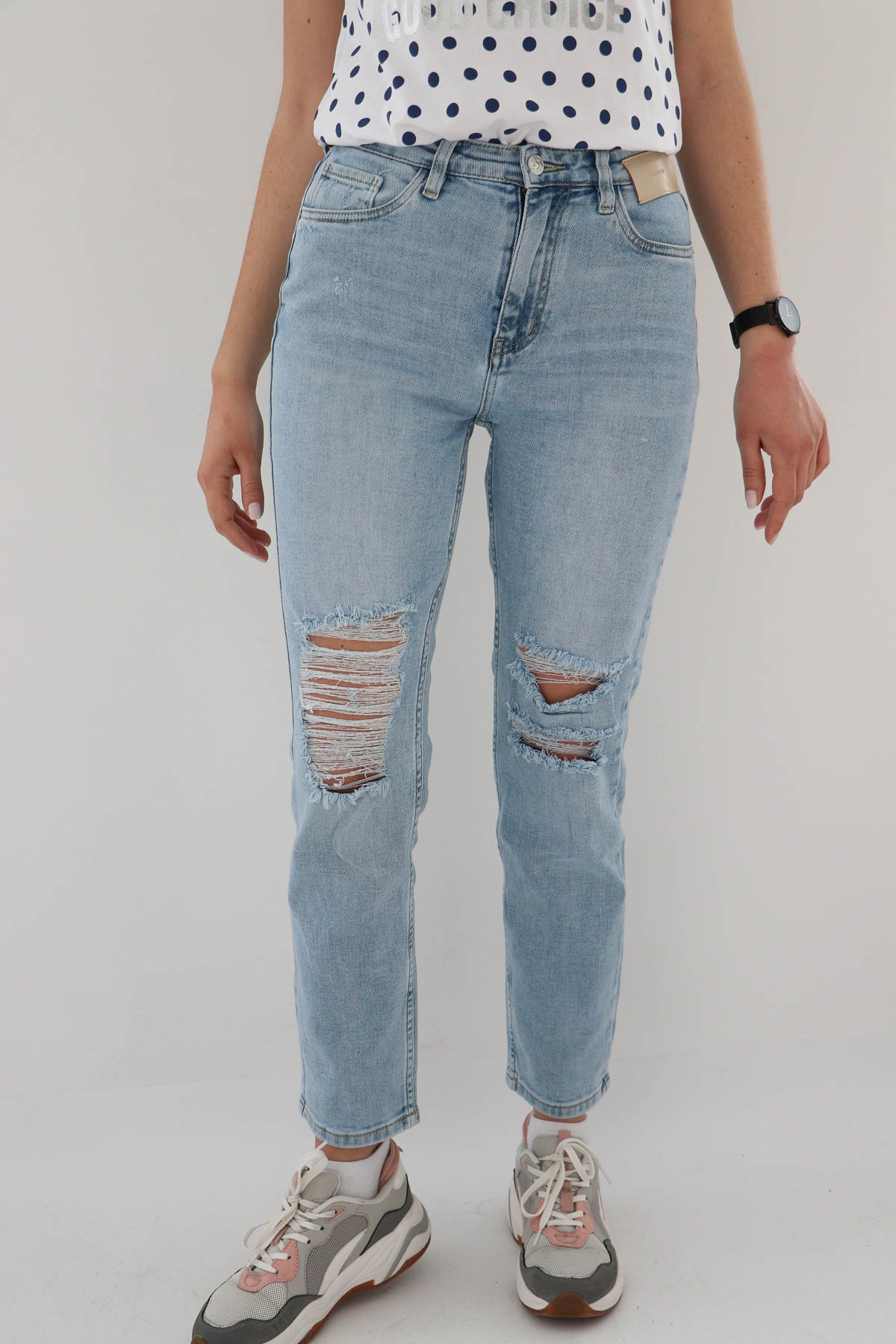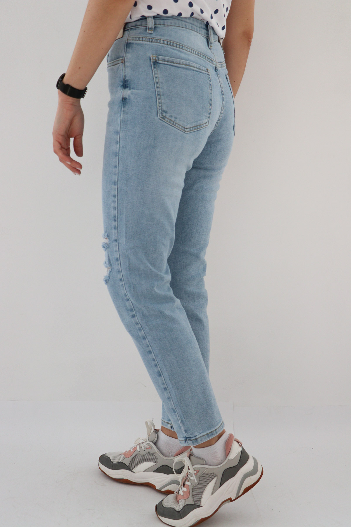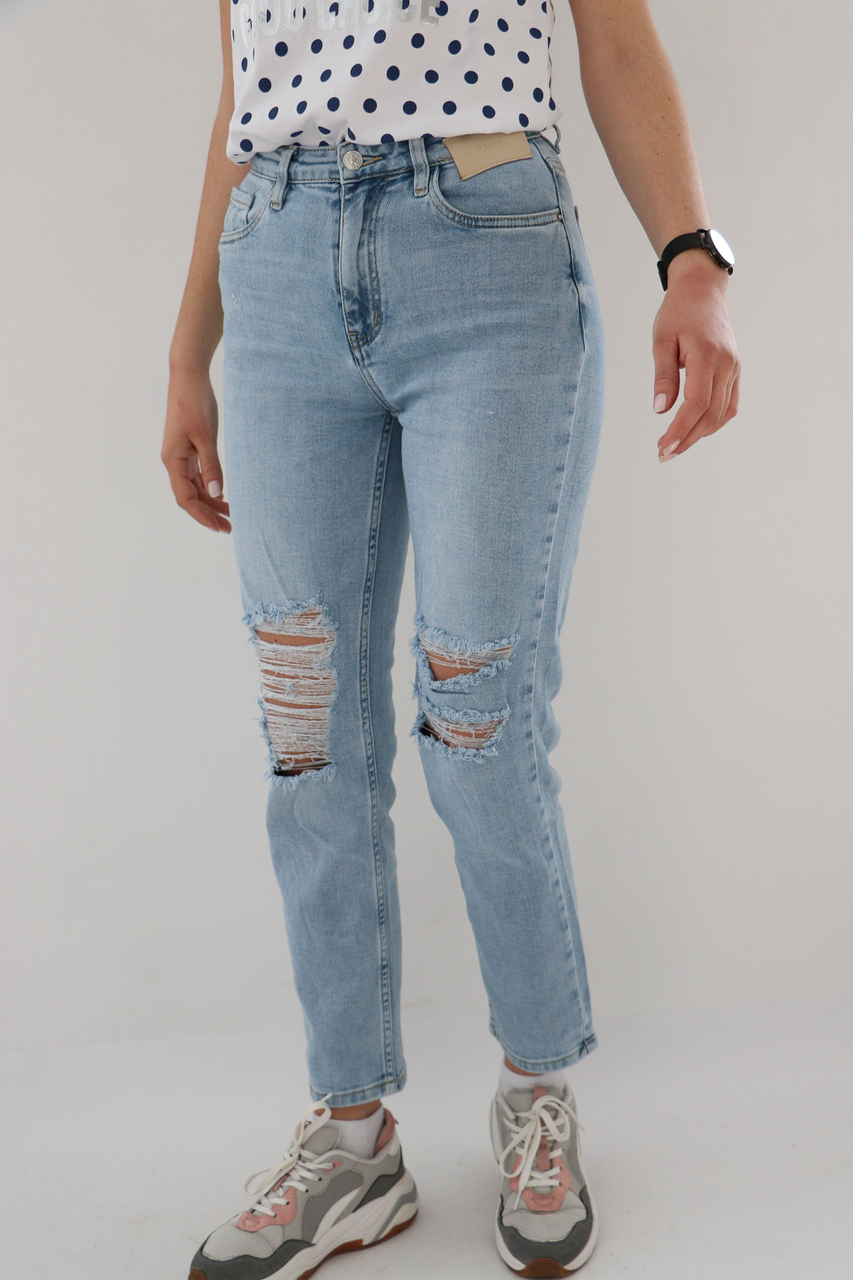 -Дамски дънки в светло син цвят с кройка на крачола по крака