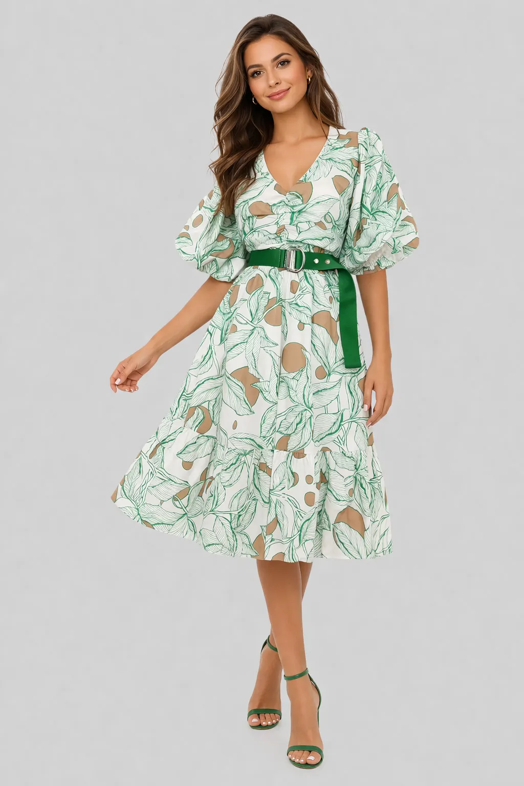 Буфан ръкавите добавят стилен обем, а V-образното деколте издължава силуета. Коланът в наситено зелено подчертава талията и придава завършен вид. В долната част роклята е завършена с нежен волан, който допринася за по-женствена визия.