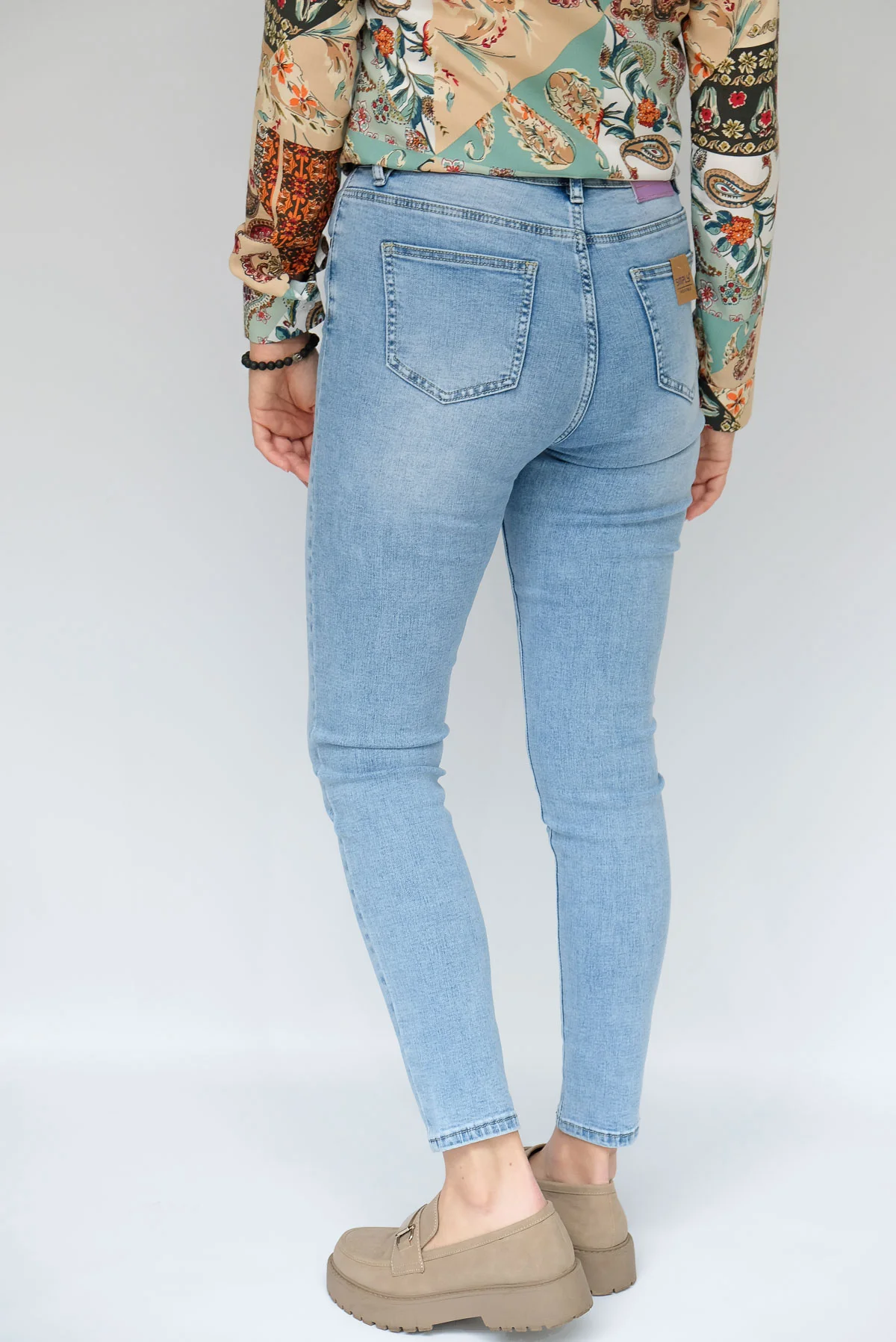 -Дамски дънки в син цвят с кройка на крачола по крака