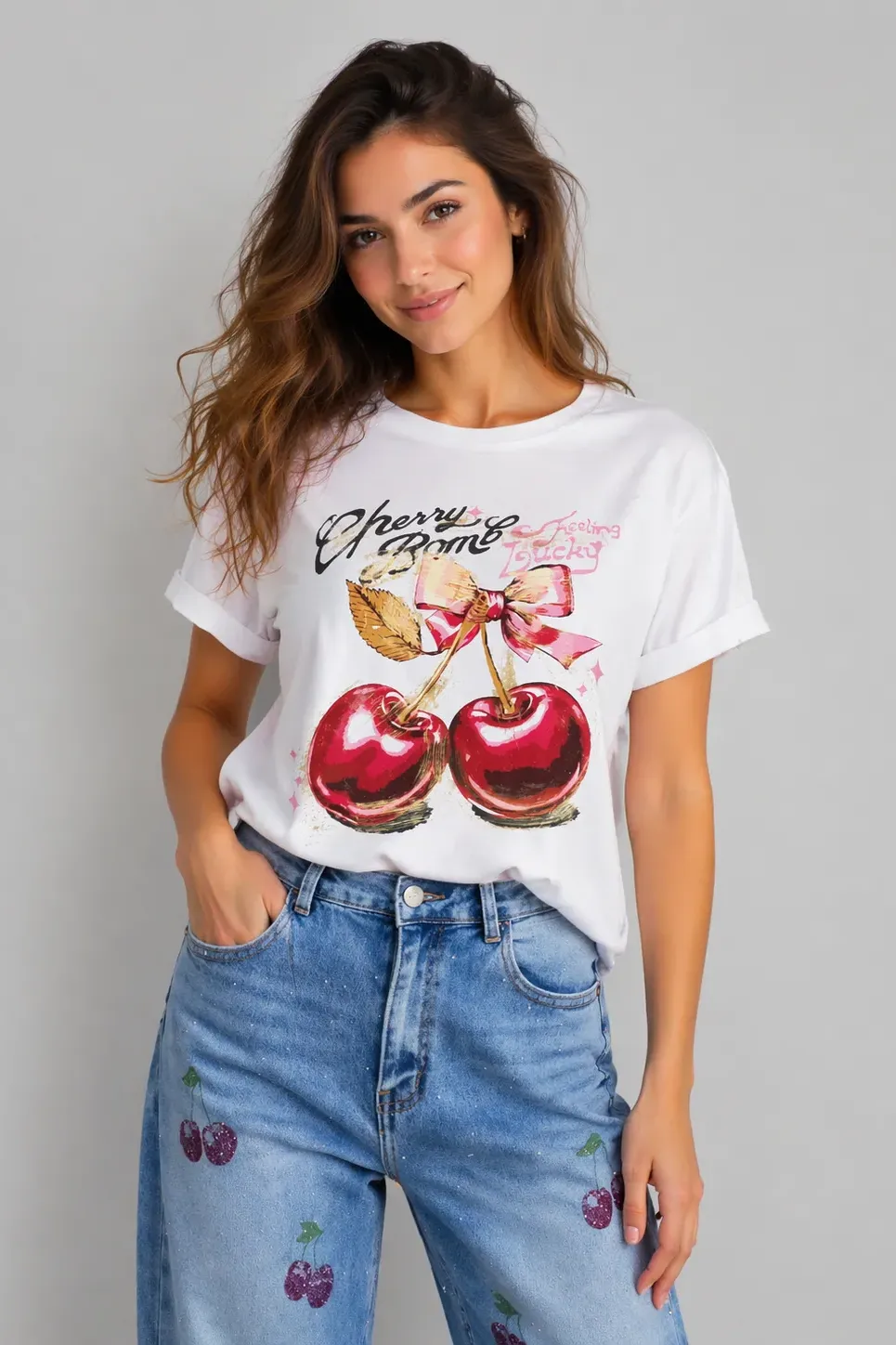 Свеж и модерен модел, който привлича вниманието с ефектен принт на череши и артистични надписи. Тениската съчетава комфорт и стил, като е идеален избор за ежедневни визии с настроение.