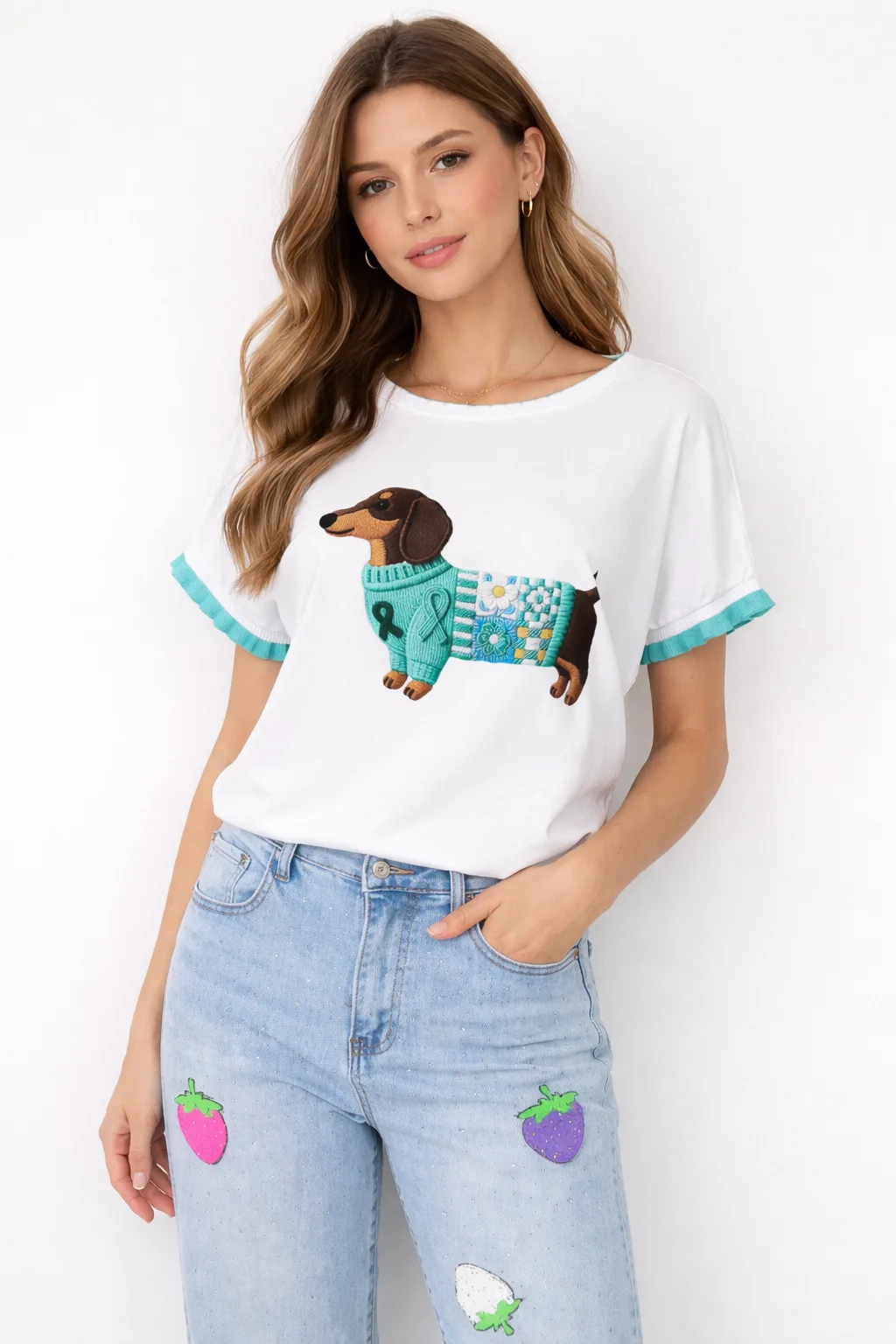Стилна и удобна дамска блуза, която ще внесе настроение във всеки ежедневен аутфит. Моделът е изработен от мека и приятна на допир материя, осигуряваща комфорт през целия ден. Акцентът е красивата апликация с куче и декоративни детайли в свежи тюркоазени нюанси, която придава оригинален и модерен вид.