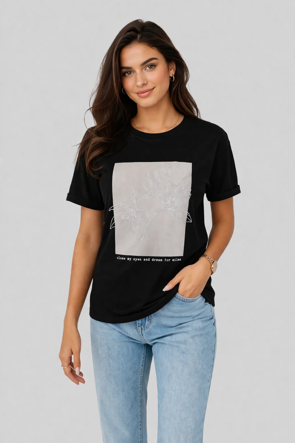 Добави финес и минимализъм към ежедневния си стил с тази модерна дамска тениска. Моделът е изработен от мека и приятна на допир памучна материя, която осигурява комфорт през целия ден. На предната част е разположен стилен графичен принт – изчистена линия цвете върху светъл фон, придружен от надпис „close my eyes and dream for miles“, който придава артистичен и мечтателен характер.