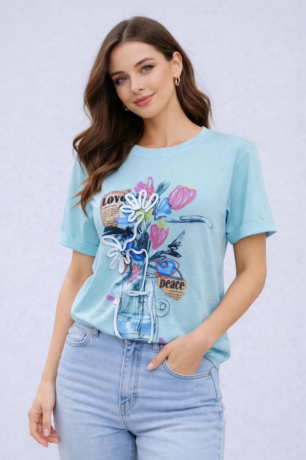 Добави финес и минимализъм към ежедневния си стил с тази модерна дамска тениска. Моделът е изработен от мека и приятна на допир памучна материя, която осигурява комфорт през целия ден. На предната част е разположен стилен графичен принт – изчистена линия цвете върху светъл фон.