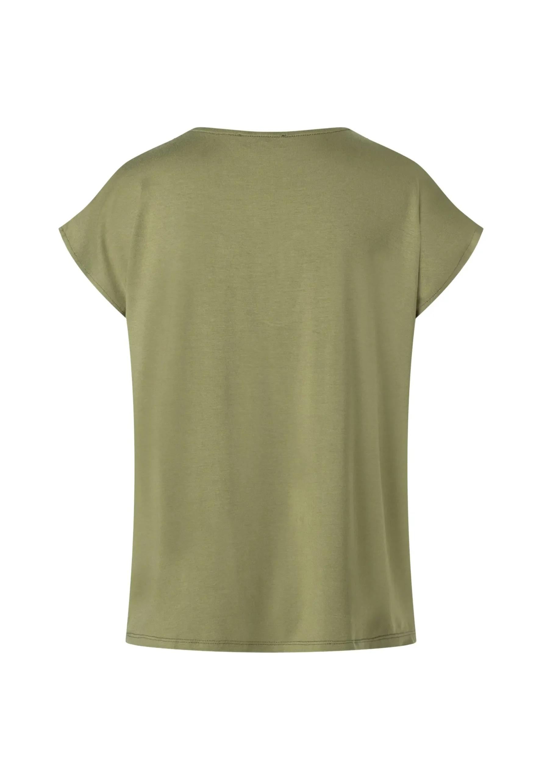 Блузата е с ефирни къси ръкави и деликатно деколте с малък отвор отпред, което добавя фин елегантен акцент. Свободната кройка я прави лесна за комбиниране както с поли, така и с панталони или дънки – идеален избор както за ежедневието, така и за по-елегантни поводи.