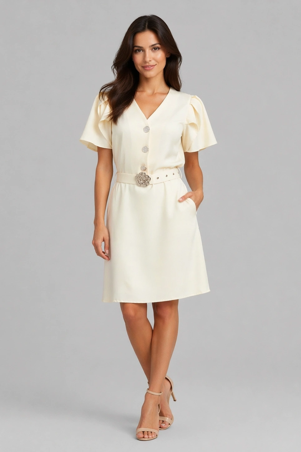 Стилна рокля в нежен кремав нюанс, съчетаваща изчистена визия и женствен силует. Моделът е с V-образно деколте и ефектни къси ръкави с лека обемност, които придават елегантен завършек.